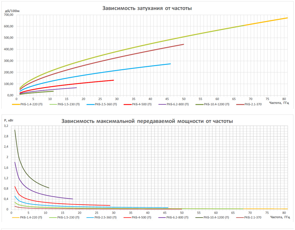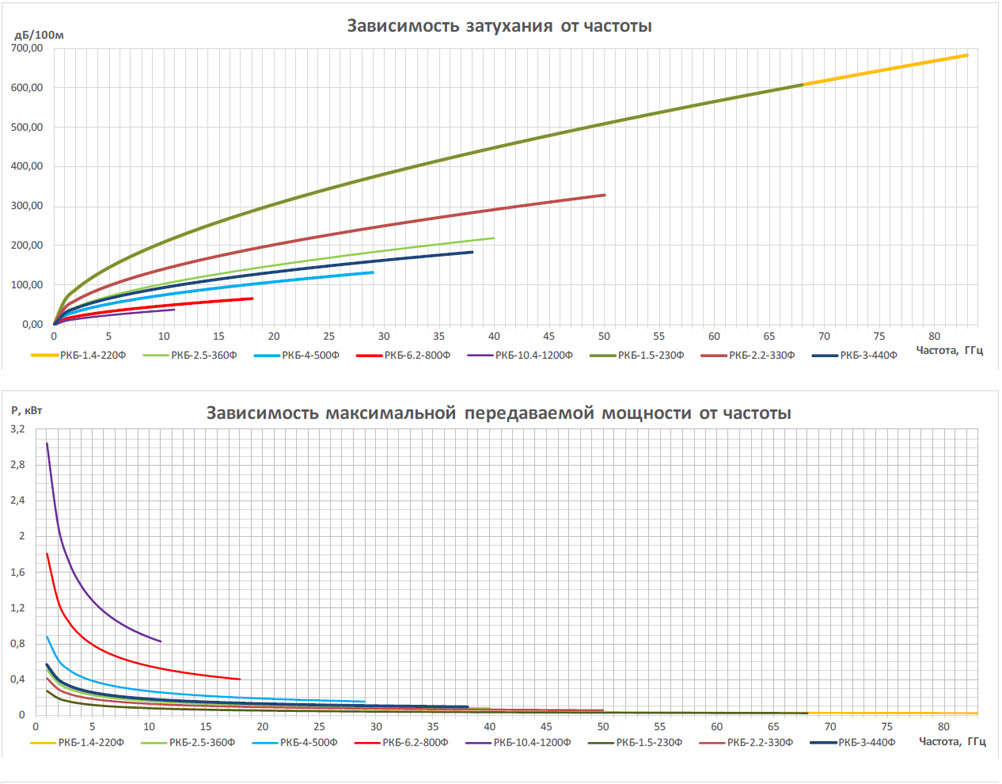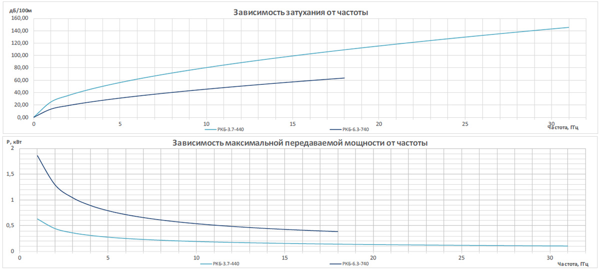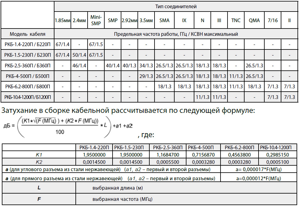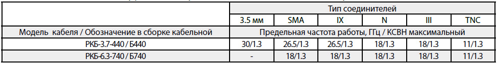 Таблица 1. Предельные параметры частоты и КСВН в сборках кабельных на основе кабелей серии РКБ с облегченной конструкцией с применением соединителей* производства ООО “РТС”