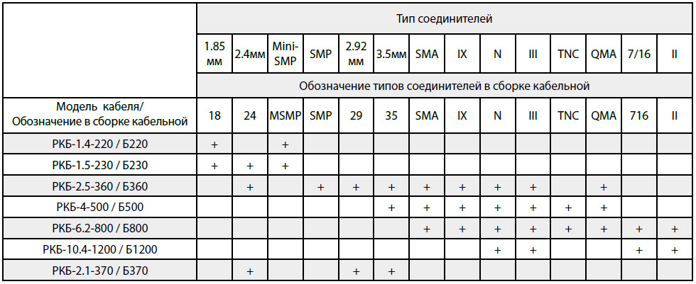 *- В данной таблице представлены основные типы соединителей, применяемых для изготовления СКР на основе фазостабильных коаксиальных кабелей серии РКБ. Если Вам необходимы СКР с типами соединителей, которые не указаны в таблице, просьба связаться с нами по электронной почте или телефону.