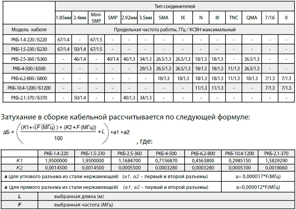 Таблица 2. Предельные параметры частоты и КСВН в сборках кабельных с применением соединителей производства ООО “РТС”