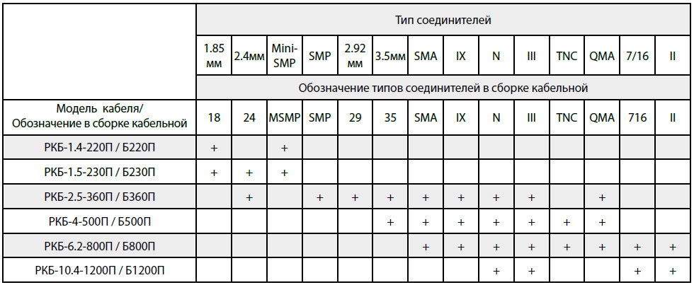 *- В данной таблице представлены основные типы соединителей, применяемых для изготовления СКР на основе фазостабильных коаксиальных кабелей серии РКБ-П. Если Вам необходимы СКР с типами соединителей, которые не указаны в таблице, просьба связаться с нами по электронной почте или телефону.