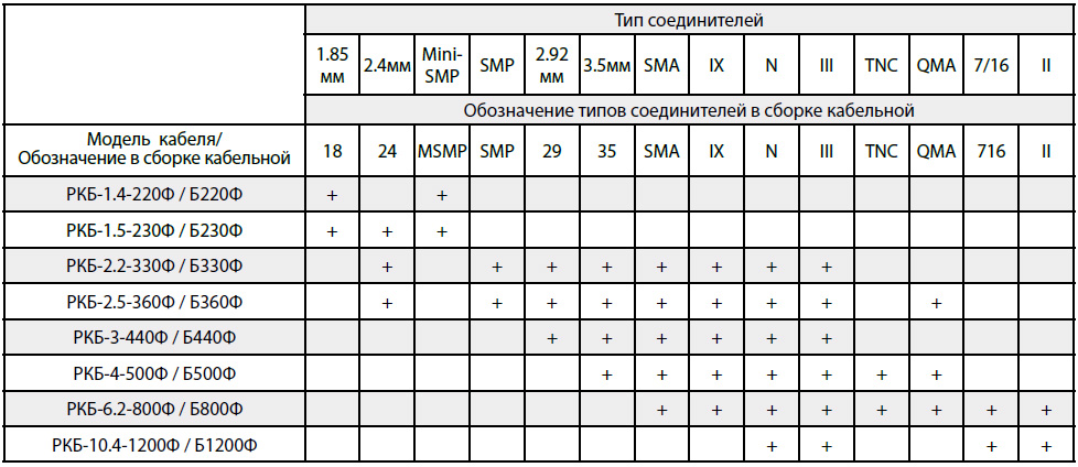 *- В данной таблице представлены основные типы соединителей, применяемых для изготовления СКР на основе фазостабильных коаксиальных кабелей серии РКБ-Ф. Если Вам необходимы СКР с типами соединителей, которые не указаны в таблице, просьба связаться с нами по электронной почте или телефону