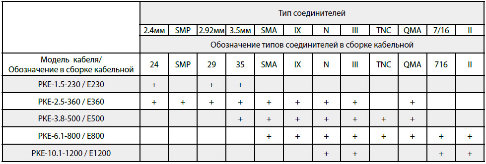 *- В данной таблице представлены основные типы соединителей, применяемых для изготовления СКР на основе фазостабильных коаксиальных кабелей серии РКЕ. Если Вам необходимы СКР с типами соединителей, которые не указаны в таблице, просьба связаться с нами по электронной почте или телефону.