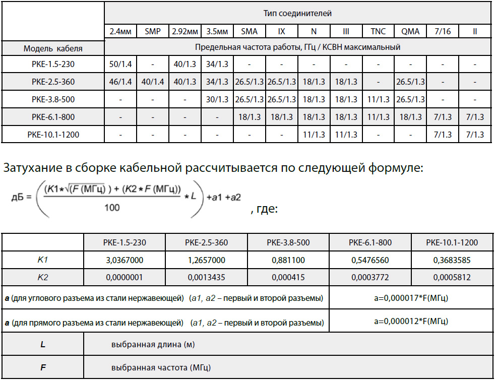 Таблица 1. Соединители* для фазостабильных коаксиальных кабелей серии РКЕ.