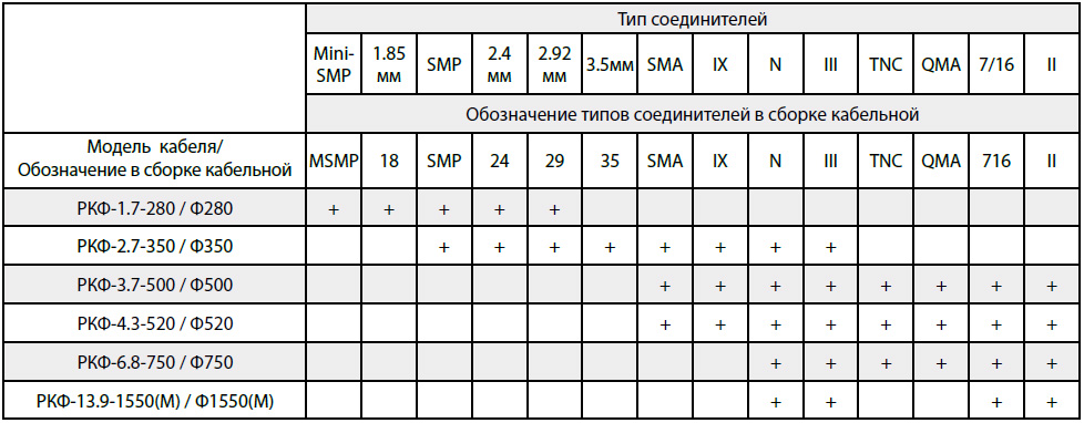 *- В данной таблице представлены основные типы соединителей, применяемых для изготовления СКР на основе коаксиальных кабелей серии РКФ. Если Вам необходимы СКР с типами соединителей, которые не указаны в таблице, просьба связаться с нами по электронной почте или телефону.